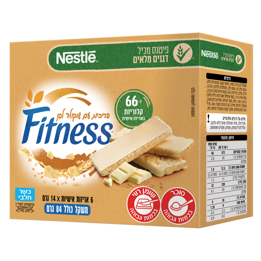 פיטנס בר מצופה בשוקולד לבן מסומן בתוויות אדומות בדומה למוצרי שוקולד אחרים, מכיוון שהוא מכיל 36 גרם סוכר ו-13 גרם שומן רווי ב-100 גרם. מנה של פיטנס בר מצופה בשוקולד לבן היא אריזה אישית של 14 ג', המכילה 5 גרם סוכר (כ-1.25 כפיות סוכר) ו-1.8 גרם שומן רווי.